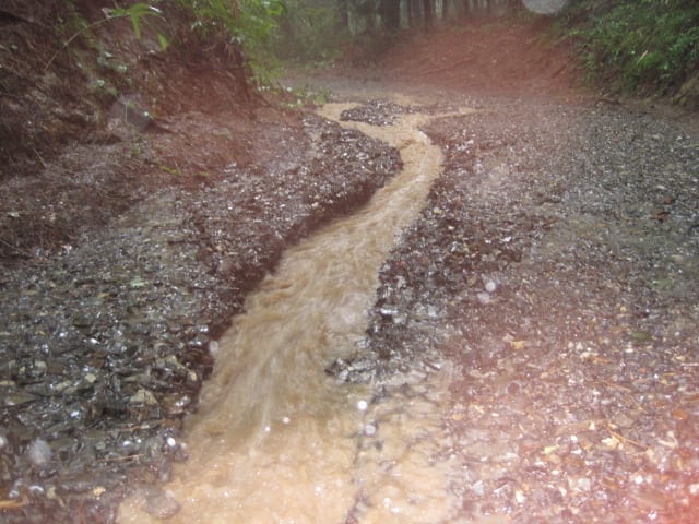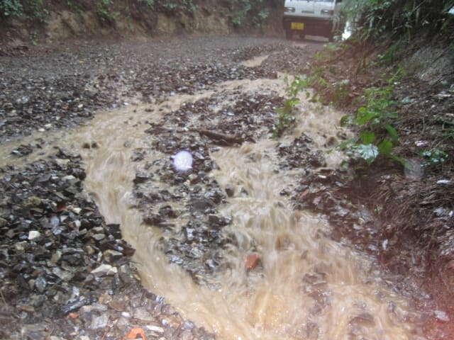 両側が山で水の通り道が無いので側溝でも作らないと何度やっても同じですね。