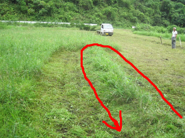 しばらく行ってからUターン↓すると写真のように刈られた草が一直線に集まるという訳。