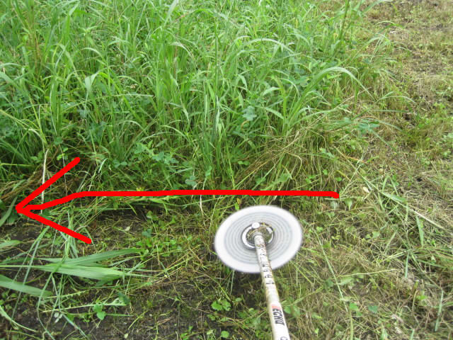 まず刃の左を少し下げ気味にして右から左に刈ると刈られた葉は左に集まります。