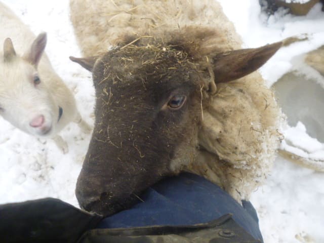 エサの濃厚飼料が欲しくてまとわりつくラクちゃん。↓